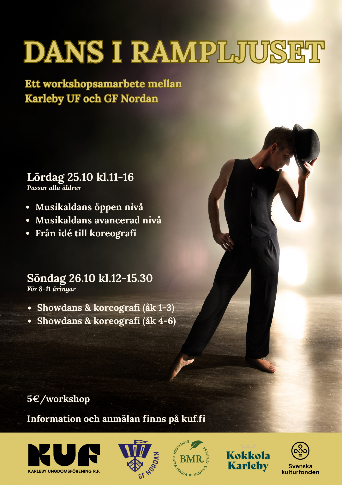 Dans och rörelse är teaterns pulsslag – de förstärker känslor, bygger stämningar och för historien framåt. Vår workshopserie bjuder på glädje, energi och gemenskap – oavsett ålder eller erfarenhet. Vi dansar till medryckande musik och kända klassiker och du får utforska dansens och teaterns samspel. På lördag erbjuds en koreografi-workshop där du själv får prova på hur rörelse kan skapa både närvaro och berättelse i rampljuset samt tekniska kunskaper i hur man kan änka kring uppbyggnaden av en koreografi.